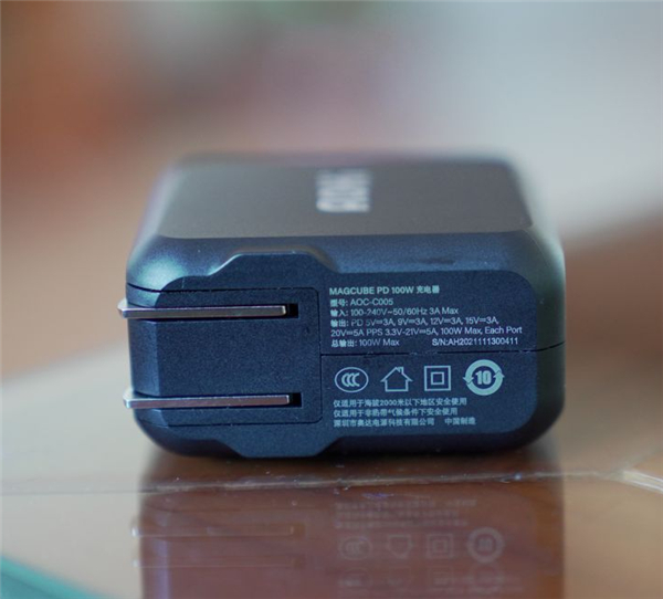 充电器插脚采用了折叠式的设计,在其旁边还有其输入输出数据的详细标注,总输出功率最大可达100W。
