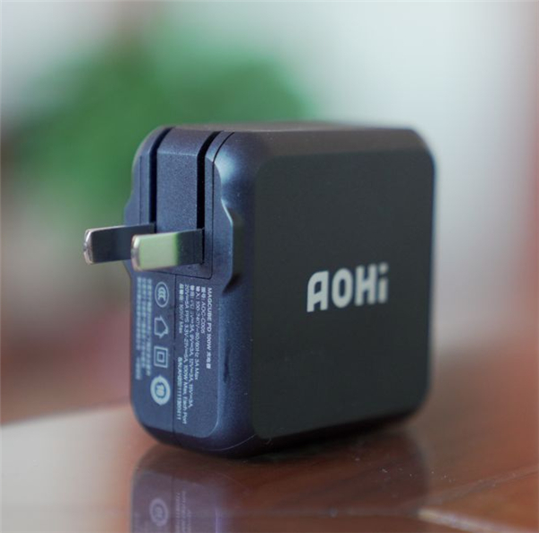 充电器的正面有显眼的AoHi标识,整机经过了黑色磨砂工艺处理,质感极佳。