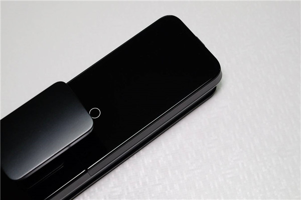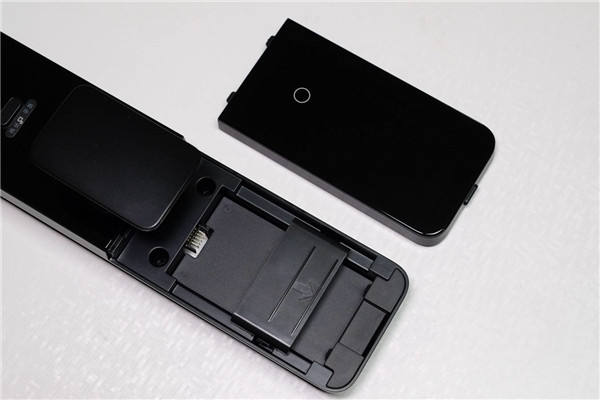 后面板的顶部是一块高分辨率的彩色屏幕,它与前面板的猫眼搭配使用,可以显示门外的监控画面。在屏幕下方的圆形标识是它的触控键,轻轻一点就能唤醒屏幕,而当息屏的时候,屏幕与黑色边框浑然一体,符合息屏美学设计。
