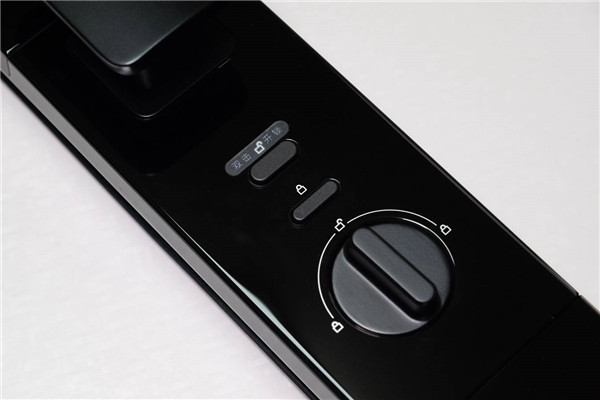 在机械后把手的下面是两个实体按键,分别是开锁键和上锁键,其中开锁需要双击。一开始我也纳闷为什么开锁要双击,但了解了一下,这是为了避免小朋友乱按而导致不小心把门打开,说起来这样的设计还挺人性化的。在按键的下方是反锁旋钮,无论是左转还是右转都能让锁芯从室内彻底地锁死。