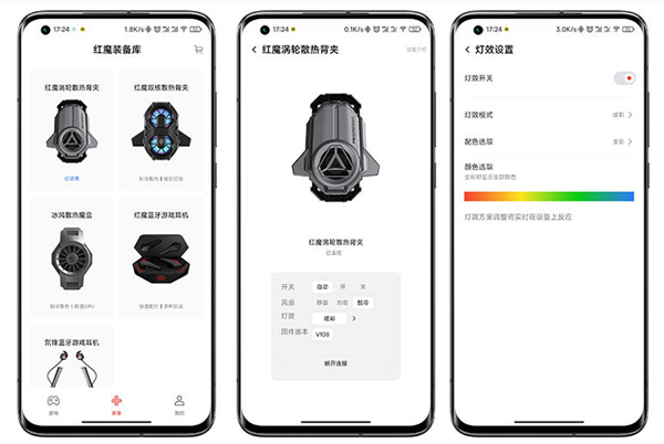 在散热背部还融入了RGB灯效设计,在红魔装配库”APP上可实现在线控制灯效,可以发出多种灯效,非常炫酷。此外,红魔涡轮散热背夹还新增智能温控灯效展示,温度由低到高,散热背夹灯效会由红变为绿,可玩性非常高。