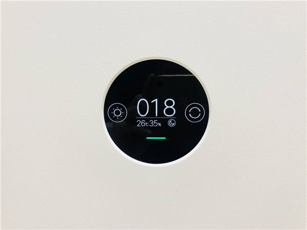 米家空气净化器Pro H是一个触控显示屏,用手轻触就可以操作,相比按键式的操作方式更加便捷。整个OLED显示屏不是很大,但是包含的内容却很全面:PM2.5数值、温湿度、运行模式、WIFI状态和空气质量状态。开机时还显示滤芯寿命。空气质量状态通过不同颜色的灯条显示,红色代表空气污染严重、橙色代表空气质量一般、绿色代表空气质量状态非常好。通过灯条就能了解到屋内空气质量状态,十分方便。