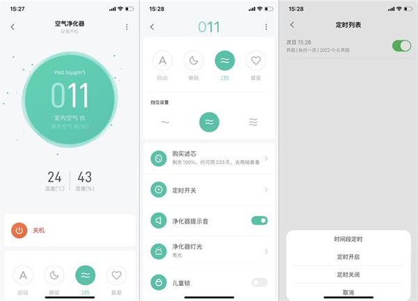 前两种操作方式简单粗暴,在家直接操作就好。着重说一下APP,不管你在哪里,通过手机APP可以隔空操作,而且还能实时了解家里空气质量状况。想要回家就呼吸上新鲜的空气,那么在下班路上就可以开启机器。APP的界面简单清晰,还显示滤芯使用状况、运行异常提醒等信息。