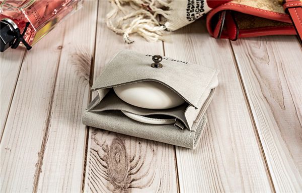 随机赠送了一个皮质收纳袋,浅灰色手工复古设计,适合不同的穿搭风格,翻盖的扣合方式很牢固,不用担心内部的充电盒会掉落,拿取也非常方便。