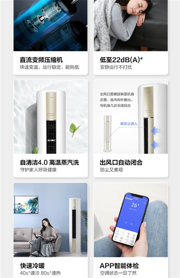 华凌N8HB1立柜式空调搭载全直流变频技术,电子膨胀阀,采用高性能压缩机驱动系统控制核心技术、双模型磁涟观测技术,实现精准控温,更加节能。冷媒采用R32.2匹APF为4.68.2匹APF为4.39.符合新一级能效标准。高频速冷热技术,基于智能P|控制器和高精度速度观测算法,压缩机数秒之内高频启动。与以往启动技术相比,出风口温度下降/上升速度有显著的提高,满足你快速制冷/制热的需求。银离子抗菌*滤网,抗菌率99%*。