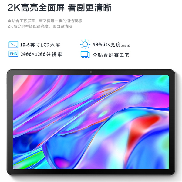 联想小新Pad 2022正面采用了一块10.6英寸、16:10标准的2K高亮全面屏,边框的宽度为5.7mm,屏占比高达85%,屏幕的尺寸不大不小可谓刚刚好,视野也更加宽阔。此外,联想小新Pad 2022的屏幕拥有2000*1200超高清2K分辨率、400nits超高亮度以及60Hz的刷新率,屏幕显示更加清晰自然。