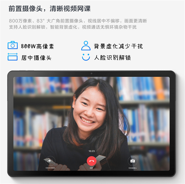 在视频会议和网课成为刚需场景下,摄像头和音频成为了两个关键性要素,所以,使用者非常重视这两个方面。首先,联想小新Pad 2022的前后双摄均采用了800万像素的高清摄像头,前置摄像头具备人脸识别功能,登录系统又快又准,亮屏即可解锁,节省了输入密码的麻烦,而且具有83°的可视面积,再视频会议中,几乎可以说是无死角的观看。前置摄像头还能够自动调节居中校准,孩子上网课的时候,视频会始终调节为正对镜头。后置摄像头支持数字对焦,拍摄1080P高清画质的照片和30fps的视频,为孩子交作业提供了极大的便利。