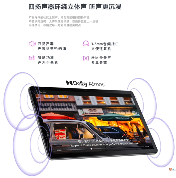 其次,音频方面,联想小新Pad 2022在位于短边的部分内植入了4个扬声单元,每个功率达到1W,与传统笔记本的功率相同,具备环绕立体声音效,声音传输更加洪亮,让学生不会错过老师讲的每一个关键点。与此同时,在通过杜比全景声认证后,让用户实现身临其境的沉浸感受。此外,麦克风被放置在顶部,收音精准,而且在大象声科的AI降噪加持下,视频会议不会再被外界噪音干扰。