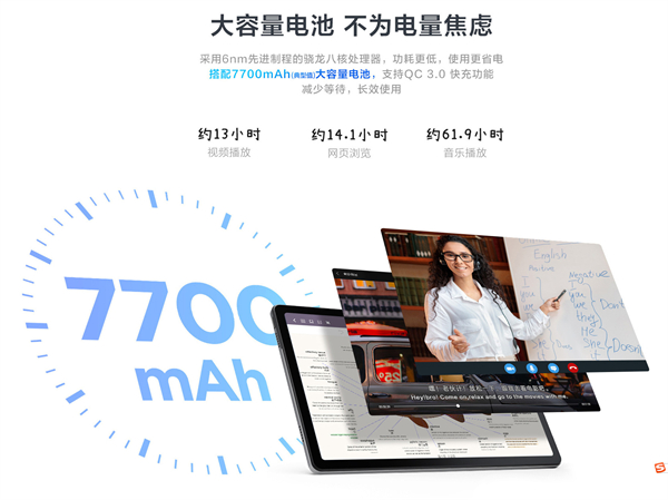 功能如此强大,用户肯定会担心联想小新Pad 2022的续航能力,总不能用着用着就没电了吧。的确,该款平板电脑配备了7700mAh的大容量电池,用官方的话说就是“续航久的离谱”,足够支撑全天的使用。经过测试,在200nits亮度,7档音量,连接WiFi和开启蓝牙的状态下,使用时长可达到10小时15分钟。此外,搭配原装20W快速充电器,从低电量自动关机状态充电至满电,需要2小时55分钟,白天使用结束,傍晚充电,睡觉前就可以充满了,是不是非常方便呢。