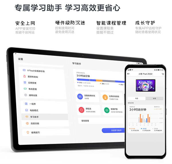用平板来学习,是家庭用户普遍的刚需,因为用手机屏幕太小,用笔记本拿起来又不是很方便,所以,平板是最佳的选择。联想小新Pad 2022具备学习助手功能,全面呵护孩子的身心健康,防止孩子沉迷于游戏当中,提供了家长控制使用时间应用,避免了过长时间的使用平板。此外,智能课程管理功能,自定义设置课程表,定时提醒不要错过关键课程。而且APP还可以安装可控软件,规避了孩子登录不良网站的危险。