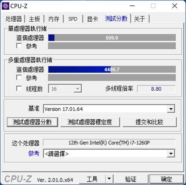 CPU-Z测试中,它的单核成绩509.多核成绩4486.7.11代H35处理器i5-11300H的多核成绩大概是2800左右,对比之下,12代P系列处理器在多核性能方面的提升可以说是相当巨大了。
