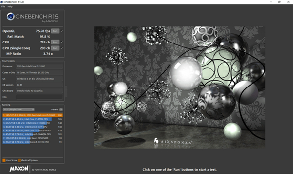 经典的CineBench全家桶环节,CINEBENCH R15单核成绩200.多核成绩749.CINEBENCH R20测试结果为单核成绩510.多核成绩1890.CINEBENCH R23测试结果为单核成绩1389.多核成绩4881.从结果来看依然是多核表现更加亮眼。