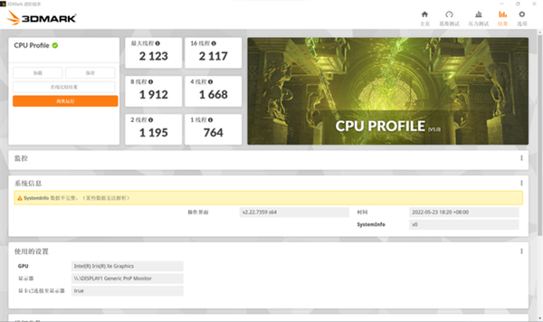 3DMark 的CPU Profile测试,它的最大线程分数为2123.单线程分数为764.