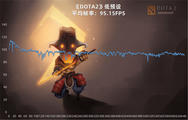 游戏实测我们使用的是《DOTA2》,1080分辨率低预设的环境下,游戏全程的平均帧率它可以保持在95.15帧,游戏过程流畅。这样的水平对于硬核玩家来讲肯定是不够的,对于工作党、商务党来讲,偶尔娱乐一把释放压力倒是一个可行的选择。