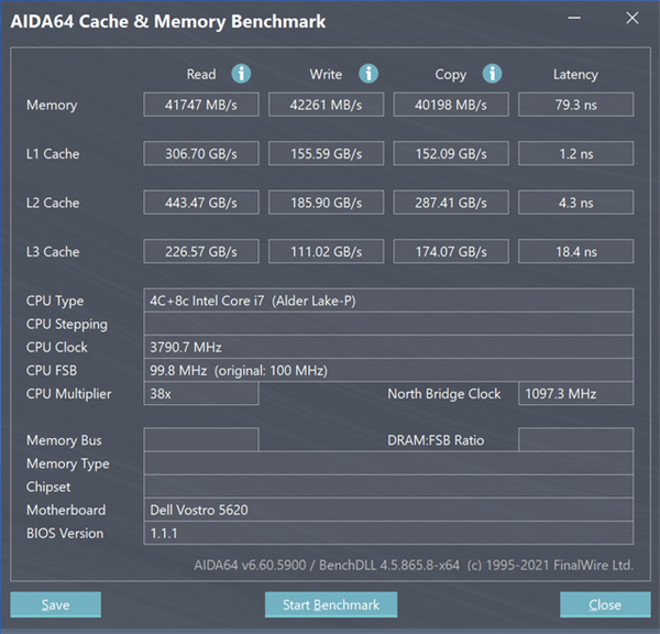使用AIDA64对其16GB的DDR4 3200MHz内存进行测试,其读取速度为41747MB/s,写入速度为42261MB/s,复制速度为40198MB/s,时延79.3ns。内存虽然不能说多么的优秀,但日常办公使用并不会拖后腿。