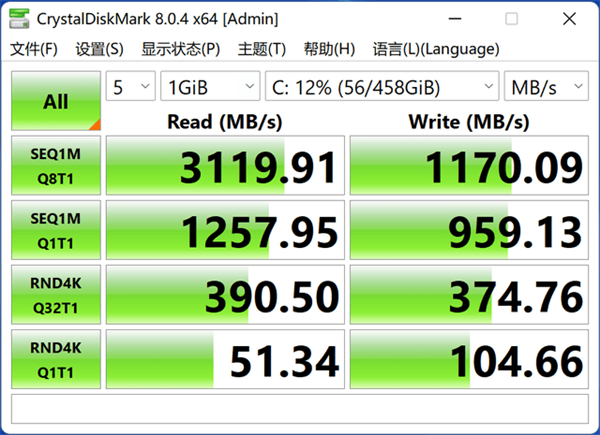 硬盘方面,512GB的SSD顺序读取速度为3119.91MB/s,顺序写入速度为1170.09.放在如今,这个成绩并不算多么优秀,对于时常需要倒腾大体积素材的创作者不太友好,日常办公的话感知则不强。