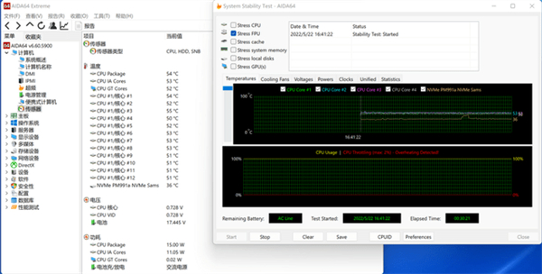 室温26℃的环境下,我们进行了30分钟单烤FPU的测试,测试中CPU功耗最高时可以达到44W,半小时后稳定在15W,温度稳定在54℃左右。这样的表现代表着整机的策略偏稳健,稳定性的优先级要高于性能释放。值得称赞的是,即使在比较极端的环境下,它的温度表现也会非常优秀。