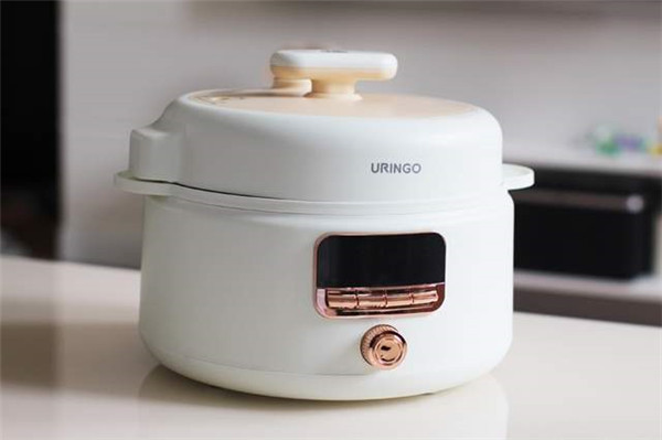 电压力锅的整机外观依旧采用了七彩叮当系列产品的白配金轻奢风格,简洁时尚。机身奶白色,玫瑰金色的控制面板和智能微电脑大屏显示,让整机看起来复古典雅,质感十足。面板尺寸约为10*4cm,字体大,显示清晰。