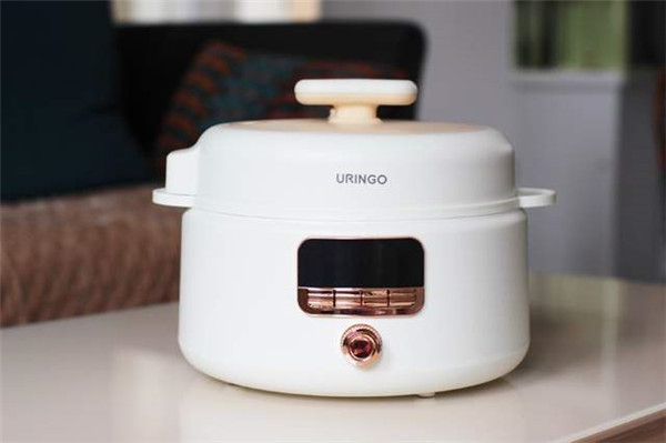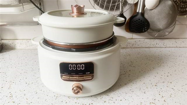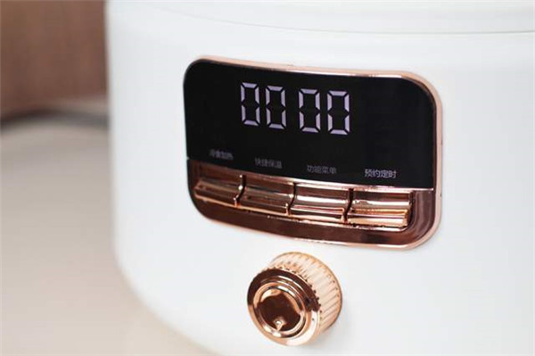 面板的下方设计有四个按键和一个旋钮,从左往右依次是冷食加热按键、保温按键、功能菜单按键及预约定时按键。其中功能菜单隐含有10种烹饪模式:煮饭、炖肉、熬粥、焖菜、火锅、无水焗、蛋糕、甜品、发酵、蒸煮,自带蒸笼满足上蒸下煮的需要,大火快速,煮顿早餐只需要10分钟;小火慢炖轻享诗和厨房的慢生活,一锅多能,厨房小白也能轻松上手。