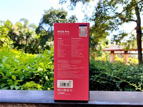 外包装背面为红色,详细列举了该款音箱的名称、型号、声音通道、材质等产品参数,并可以看到制造商和生产商信息。