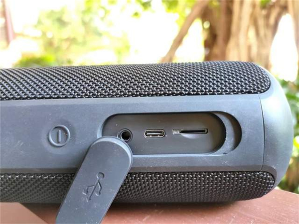 音箱整体采用了ABS和硅胶材质,户外使用耐冷耐热防腐蚀,箱体除了纺织网布处的+/-键,还有一枚开关机键位于硅胶部位,开机键下方硅胶封口用于音箱防水,打开后可以看到三个孔位,分别是AUX音频接口、TYPE-C充电口、TF插卡口,盖上硅胶封口,音箱就处于IPX7级防水。