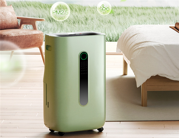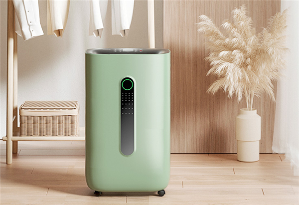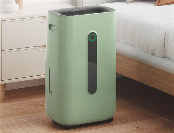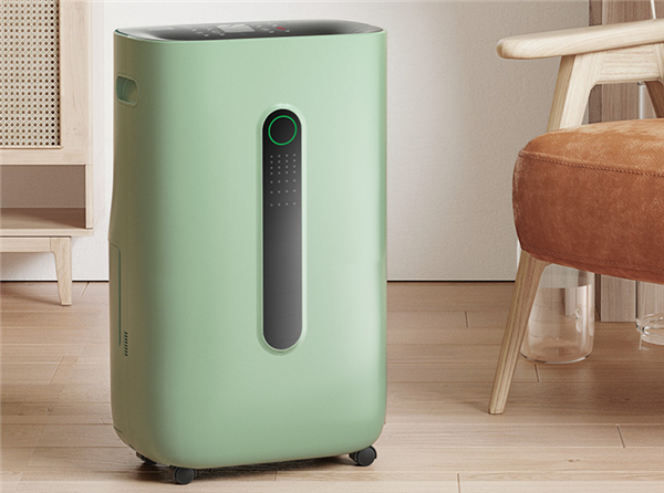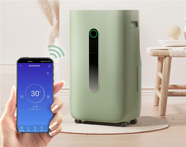 在外观设计上,这款斗禾除湿机采用了比较圆润的造型设计,配色则采用了绿色与黑色相配搭,重量约15kg,配合底部四个万向轮移动起来很方便,在日常的使用中,可以根据除湿需求在客厅、臥室、卫生间轻松地来回切换使用。