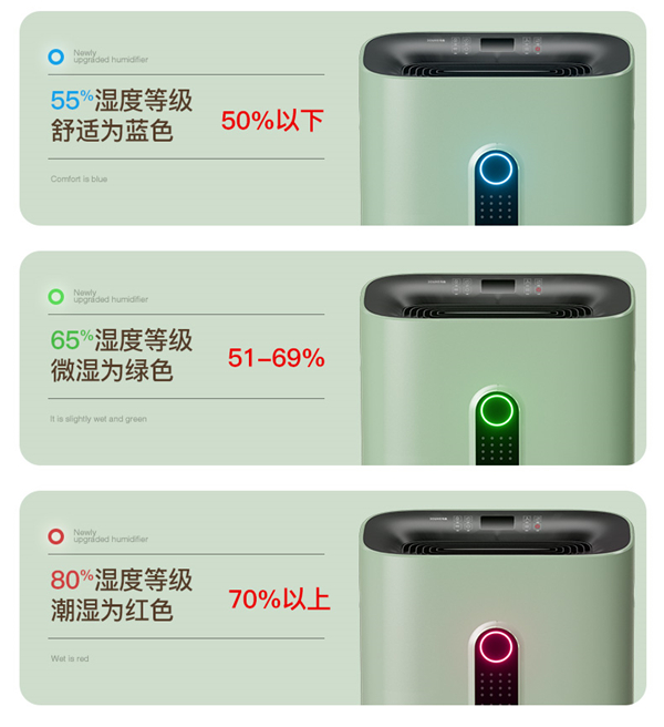 机身正面的一条黑色装饰条,为机身起到了不错的点缀作用,同时加入了一个圆形的LED提示灯,在除湿机工作时,提示灯会根据周围环境的湿度而显示不同的颜色,红色表示当前环境湿度高于70%;绿色表示湿度在50%-70%;低于50%显示蓝色。