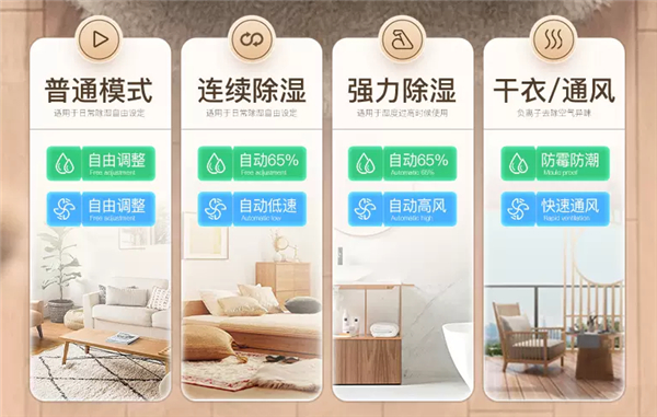 除湿机的噪音主要来自压缩机,风扇等这些配件,斗禾除湿机有4种模式可以选择。