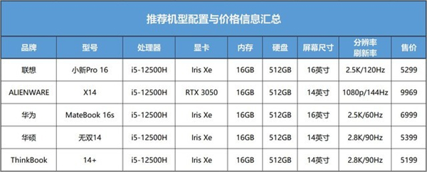 高效商务办公笔记本推荐:标压酷睿轻薄本推荐机型的配置与价格信息如下图: