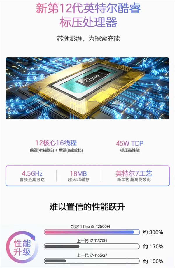除了颜值在线,华硕a豆14 Pro新品搭载了全新英特尔12代酷睿标压处理器,12核心16线程,最高睿频4.5GHz,18MB超大L3缓存,带来约300%的性能跃升。
