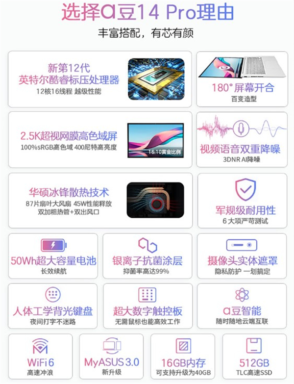 现在的年轻人换新笔记本电脑不仅仅追求性能,高颜值和轻薄都成为了许多年轻人首要考虑因素最近发布的华硕a豆14 Pro就受到了许多年轻人的追捧,下面就让我们一起来看看华硕a豆14 Pro到底有哪些亮点吧~