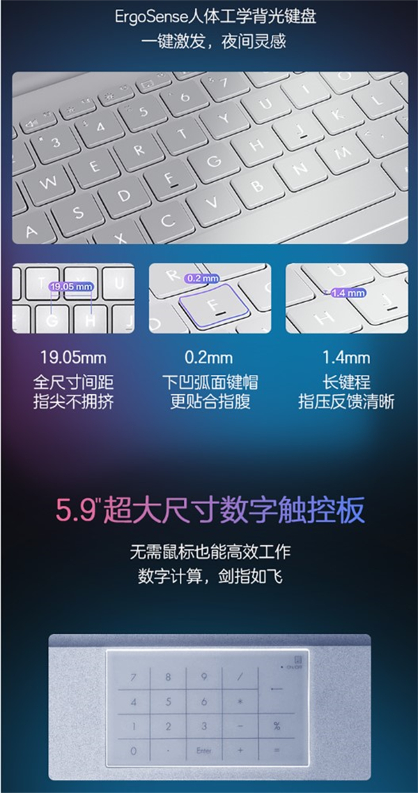 16GB双通道内存再加上512GB SSD固态硬盘,能够更好地运行PS、Pr以及其它办公和学习应用。50Wh超大容量电池,加上华硕冰锋散热技术,双加粗热管+双出风口,让整机性能释放达45W。180°的屏幕开合,百变造型,让你随心处置。5.9英寸超大尺寸数字触控版,让你无需鼠标也能剑指如飞。