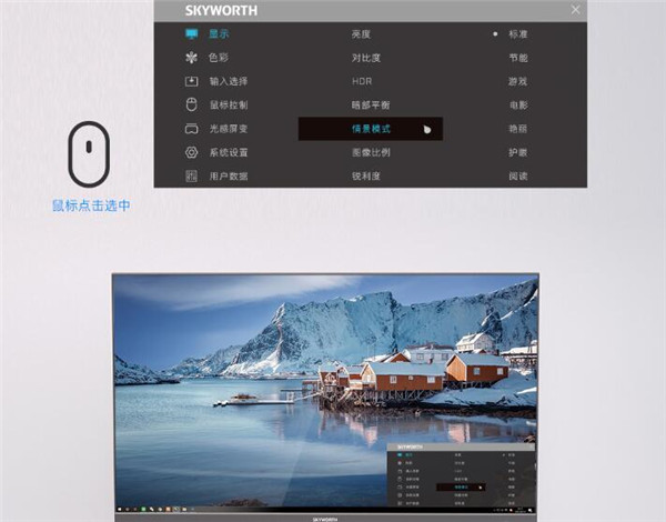 鼠标控制OSD,不同于传统按键的繁琐操作,配合创维显示器定制Ul界面,只需鼠标点击即可轻松选中菜单,滚轮实现精准亮度、色温等功能调节,实现全新交互方式。