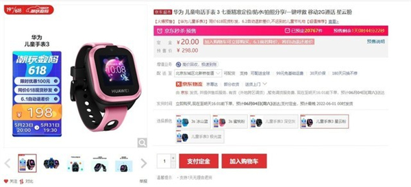 华为儿童电话手表 3拥有七重精准定位支持国内4000多家大型商场、医院等场所室内定位,快速精准,时刻帮你掌握孩子的位置。IP67防水夏季玩水也可以随身佩戴,另外还拥有拍照分享和一键呼救等功能。满电状态下可使用2-3天,周末外出续航完全可以满足。京东报价298元,现在参与预定支付20元定金,最终到手价198元。