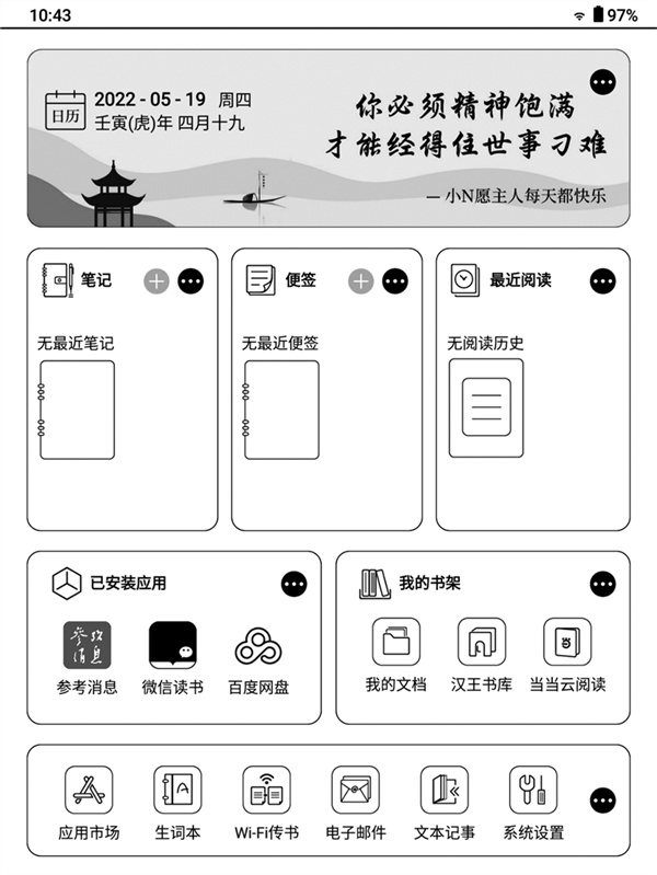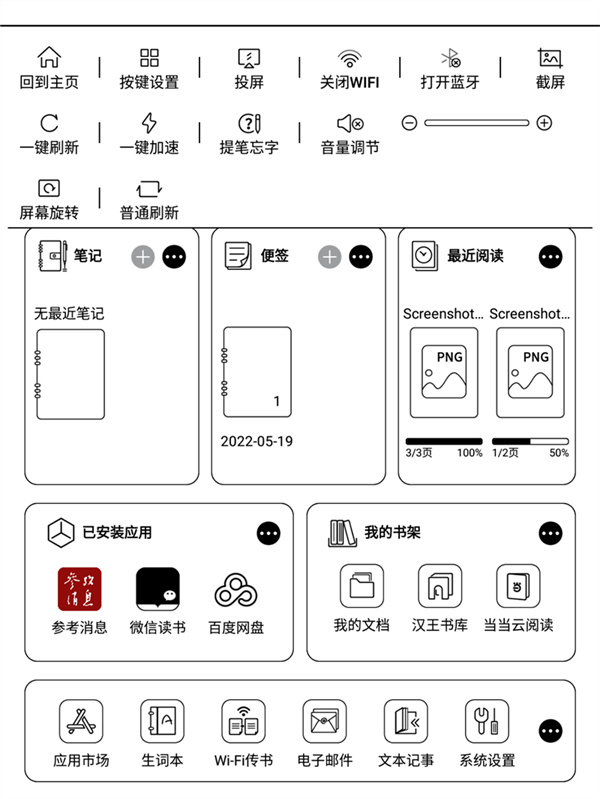汉王手写电纸本N10使用的系统为Android 11,用户可自行安装第三方APP,如果有常用的阅读类APP也可以自行安装。主页整体布局还是清爽简洁的,以实用为主。