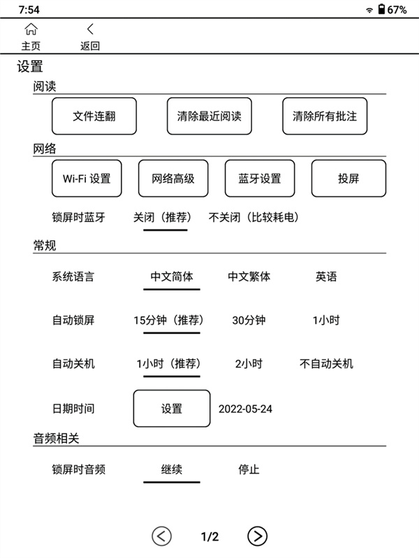 需要注意的是,虽然这里有音量调节,但因为汉王手写电纸本N10本身没有扬声器,它实际上是用来控制有线或无线耳机的。