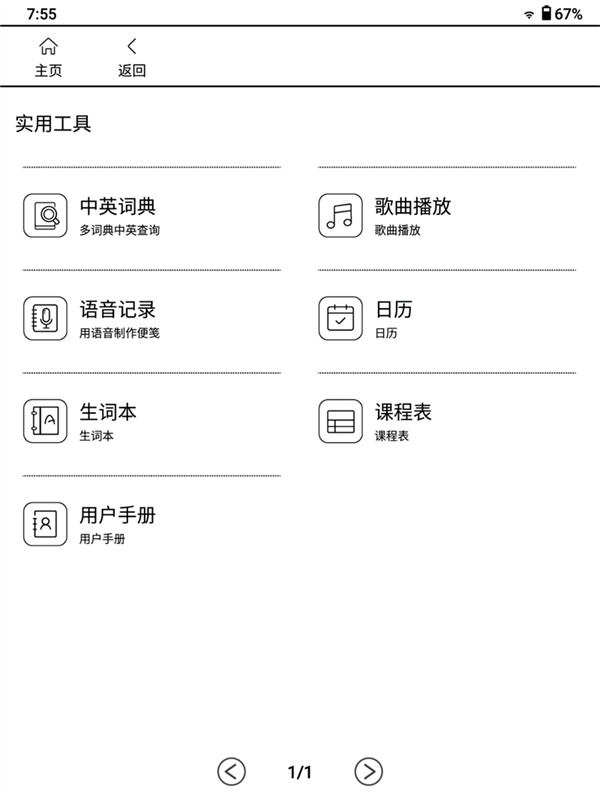 通过主页底部的系统设置旁边的“…”进入使用工具,汉王手写电纸本N10提供了中英词典、生词本、课程表对学习党比较友好的工具。
