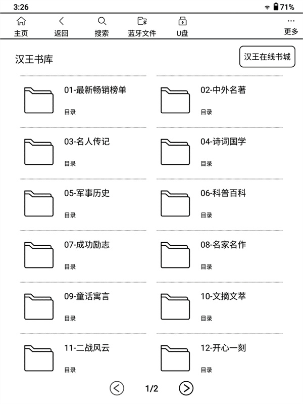 汉王手写电纸本N10的汉王书库带了1000+本地书籍,涵盖了各类中外名著、诗词国学、科普百科等类目,用户也可以在自行打开在线书城查找自己感兴趣的资源导入。