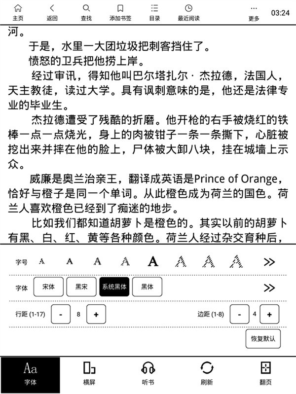 常见的字号、字体、行距、边距选择都可以自定义,可根据习惯进行左右手调节,字体、行距、间距、横竖屏自由设置。
