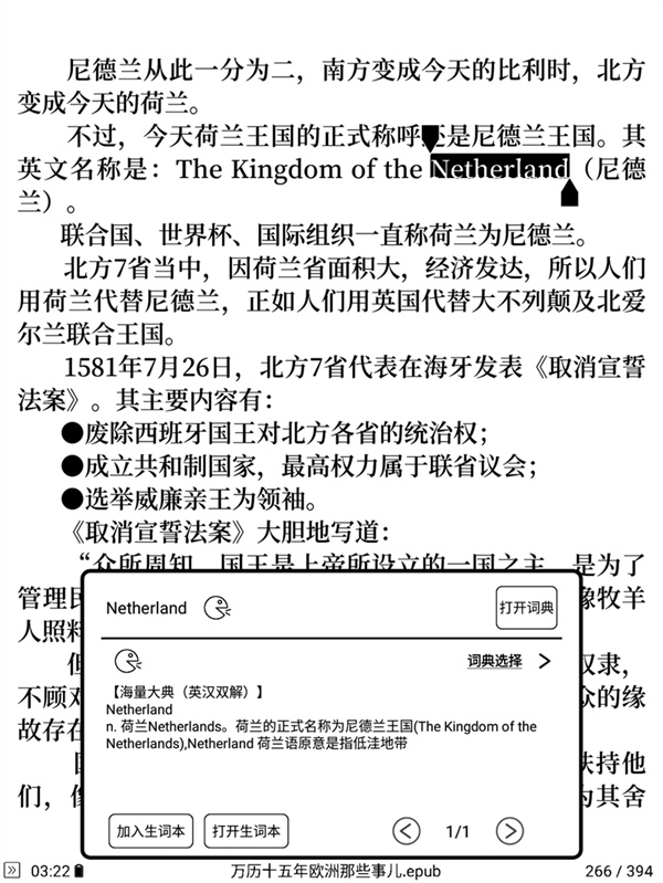 在阅读过程中,使用电磁笔长按不认识的英文单词可以看释义,也可以将单词添加到生词本,提升学习效率。