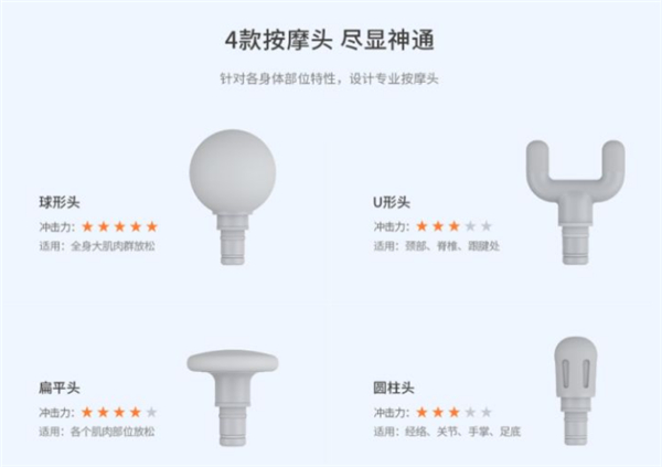 包括预装在机身上的按摩头在内,麦瑞克这款筋膜枪共有4个不同类型的按摩头,预装在机身的按摩头采用球形外观,EVA材质,适合全身大肌肉群放松,其它3种分别为平扁头、圆柱头和U型按摩头,头体均采用亲肤硅胶材质,触感Q弹丝滑,无论哪种类型的按摩头,都会在保证足够力度的同时不会带来痛感。