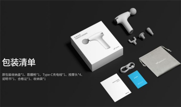 包装盒内采用塑料造型承装筋膜枪的所有物品,主机和附件均有独立的凹槽进行存放,物品之间不会产生摩擦,而且在包装盒内的固定相当牢固。