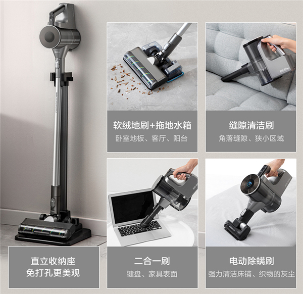 现在的无线吸尘器,都会配有不同的刷头,满足日常不同的清洁需求。在这一点上,美的Q6也不例外。比如,软绒地刷可以用来清扫卧室、客厅、阳台和厨房的地板;缝隙清洁刷可以用来清扫沙发等缝隙的灰尘(不知道其他有孩子的家庭怎么样,我家沙发缝隙就从来没干净过);电动除螨刷可以用来清洁床铺或者其他织物表面的灰尘;二合一刷头不但可以用来清洁家具表面、键盘的缝隙等。