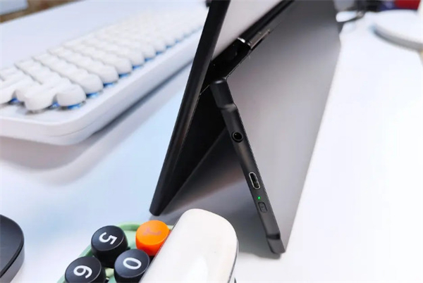 这个支架的两边,还有着一些接口,包括2个全功能Type-C接口,这些Type-C既可以连接电源线,也可以连接显示线,可谓是一口多用。还有1个接键鼠的Type-C接口,1个3.5mm耳机接口和1个mini HDMI接口。