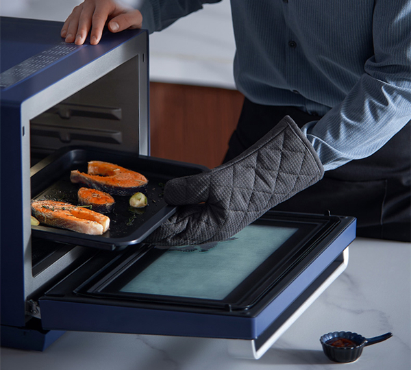 宜盾普微蒸烤箱的烤箱门自带停顿铰链。其实不论是做烤箱菜还是烘焙,途中都是难免需要开门的,比方说烤鸡翅翻个面,上色差不多了加盖锡纸,能自停顿的话就不需要完全打开烤箱门,既能减少热量损失又好操作。多角度可调用起来非常方便,完全放平之后还是个完美的置物板,另外门把手也是防烫的,可以全方位保证使用安全。