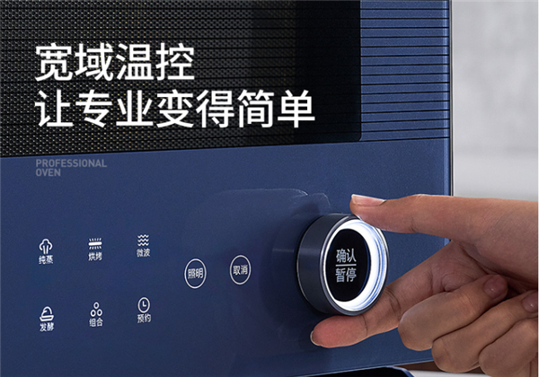 屏幕内嵌的液晶屏分为显示区和触摸区,显示区会显示当前工作模式、温度设定以及时间,通过旋钮可以切换内置的几种模式,甚至无需配置温度就可以开始大展身手,对新手来说实在是过分友好,触屏区则可以选择蒸汽、微波、烘烤、发酵、组合以及支持24小时预约,可以根据不同食材,设定需要预约烹饪的时间,还有独有的烘焙长按1分钟可以喷蒸汽。