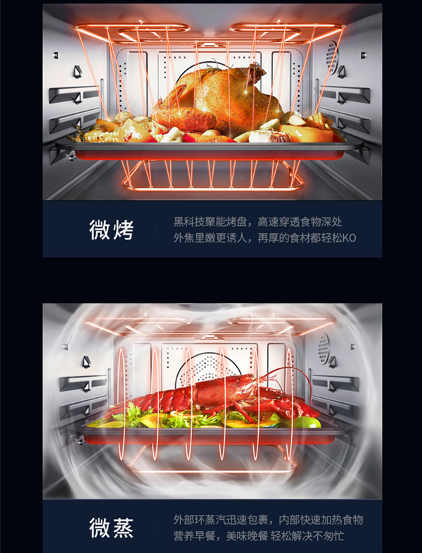 蒸汽功能支持30~120℃的温度范围,背部290个蒸汽孔不仅完全满足家庭日常需求,出品也相当优秀,用起来高效又便捷;烘烤的温度范围则有100~230℃,这可是市面上很多烤箱都没有的最高温度值,同时还具备上下管独立工作以及热风烤和果干功能;微波的功率范围覆盖100~1000W,低中高火都可以完美调节;发酵功能就更棒了,做过面包的盆友都知道面包发酵需要保持湿度,用烤箱都需要放进去一碗热水,有了蒸烤箱嘛,就可以直接发酵,不用再这么麻烦啦~