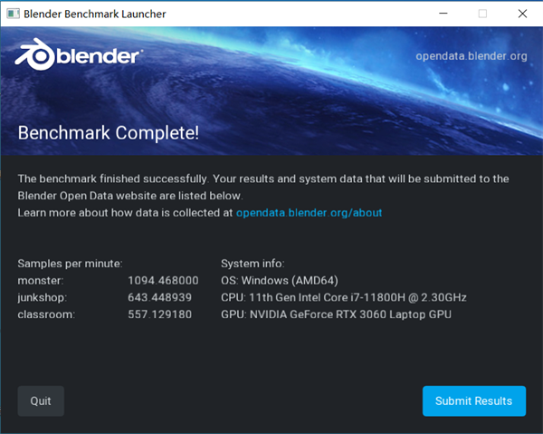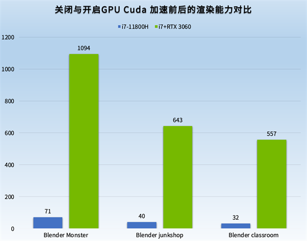 在建模渲染类软件中,GeForce RTX 3060 GPU 可以利用 CUDA 为工作提供硬件加速,目前几乎所有的建模软件都会对 NVIDIA 的 GPU 有优化,所以能做到效率、稳定和兼容性的共存。我们这里选择几款常用的建模渲染软件测试一下。首先是近年来大火的开源建模软件 Blender,如果我们单用 i7-11800H 这个 CPU 来跑的话,效率是很差的。