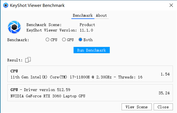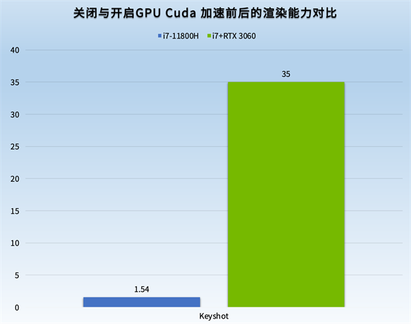最后我们跑一下另外一款渲染软件 KeyShot,我们同时跑 i7-11800H+RTX 3060 笔记本电脑 GPU 两颗核心,这回差距可就大了。CPU 得分为 1.54.GPU 得分为 35.24.差距显而易见。