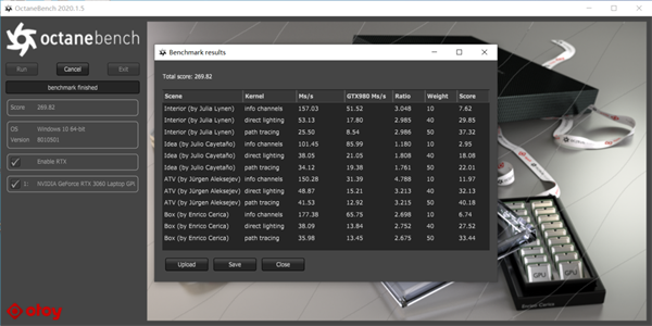 另外一款 C4D 适用的渲染软件 octane 中,BenchMark 结果如下。以 GTX 980 作为对比,各项分数都领先了 3 倍左右,看来 RTX 30 系列 GPU 的生产力这几年来的确有了不小提升。